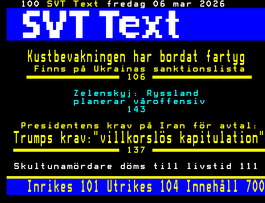 SVT Text Fre 06 Mars 2026 Kustbevakningen har bordat fartyg Finns på Ukrainas sanktionslista 106 Zelenskyj: Ryssland planerar våroffensiv 143 Presidentens krav på Iran för avtal: Trumps krav:"villkorslös kapitulation" 137 Skultunamördare döms till livstid 111 Inrikes 101 Utrikes 104 Innehåll 700 +Dela 19:51