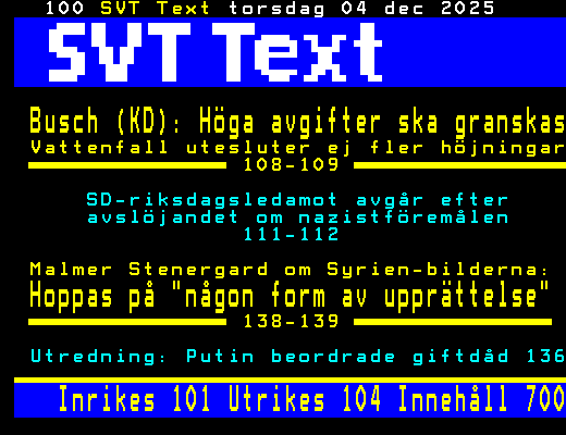 SVT Text Tors 04 Dec. 2025 Busch (KD): Höga avgifter ska granskas Vattenfall utesluter ej fler höjningar 108-109 SD-riksdagsledamot avgår efter avslöjandet om nazistföremålen 111-112 Malmer Stenergard om Syrien-bilderna: Hoppas på "någon form av upprättelse" 138-139 Utredning: Putin beordrade giftdåd 136 Inrikes 101 Utrikes 104 Innehåll 700 +Dela 15:50
