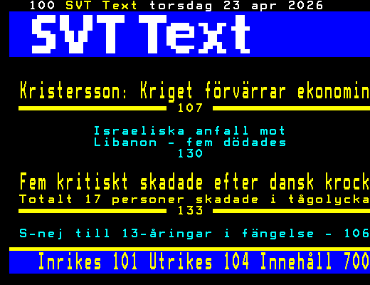 Kristersson: Kriget förvärrar ekonomin107Israeliska anfall mot Libanon - fem dödades 130Fem kritiskt skadade efter dansk krock Totalt 17 personer skadade i tågolycka133S-nej till 13-åringar i fängelse - 106 Inrikes 101 Utrikes 104 Innehåll 700+Dela 11:53