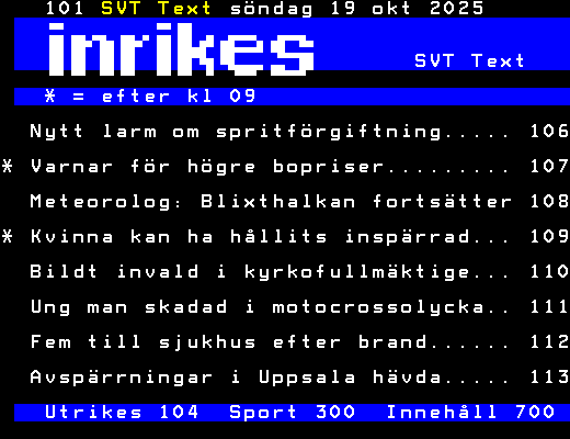SVT Text Sön 19 Okt. 2025 SVT Text * = efter kl 09 Nytt larm om spritförgiftning..... 106 * Varnar för högre bopriser......... 107 Meteorolog: Blixthalkan fortsätter 108 * Kvinna kan ha hållits inspärrad... 109 Bildt invald i kyrkofullmäktige... 110 Ung man skadad i motocrossolycka.. 111 Fem till sjukhus efter brand...... 112 Avspärrningar i Uppsala hävda..... 113 Utrikes 104 Sport 300 Innehåll 700 +Dela 10:45