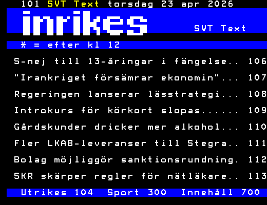SVT Text Tors 23 Apr. 2026 SVT Text * = efter kl 12 S-nej till 13-åringar i fängelse.. 106 "Irankriget försämrar ekonomin"... 107 Regeringen lanserar lässtrategi... 108 Introkurs för körkort slopas...... 109 Gårdskunder dricker mer alkohol... 110 Fler LKAB-leveranser till Stegra.. 111 Bolag möjliggör sanktionsrundning. 112 SKR skärper regler för nätläkare.. 113 Utrikes 104 Sport 300 Innehåll 700 +Dela 12:02