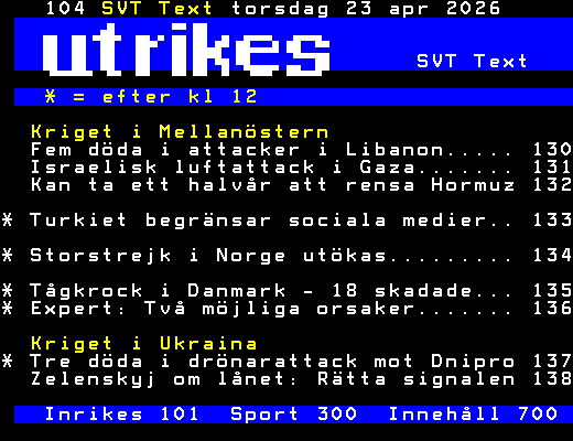 SVT Text Tors 23 Apr. 2026 SVT Text * = efter kl 12 Kriget i Mellanöstern Fem döda i attacker i Libanon..... 130 Israelisk luftattack i Gaza....... 131 Kan ta ett halvår att rensa Hormuz 132 * Turkiet begränsar sociala medier.. 133 * Storstrejk i Norge utökas......... 134 * Tågkrock i Danmark - 18 skadade... 135 * Expert: Två möjliga orsaker....... 136 Kriget i Ukraina * Tre döda i drönarattack mot Dnipro 137 Zelenskyj om lånet: Rätta signalen 138 Inrikes 101 Sport 300 Innehåll 700 +Dela 12:58