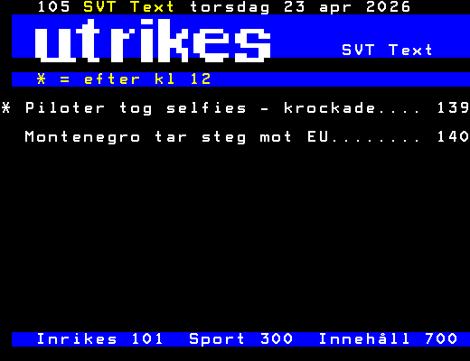 SVT Text Tors 23 Apr. 2026 SVT Text * = efter kl 12 * Piloter tog selfies - krockade.... 139 Montenegro tar steg mot EU........ 140 Inrikes 101 Sport 300 Innehåll 700 +Dela 12:57