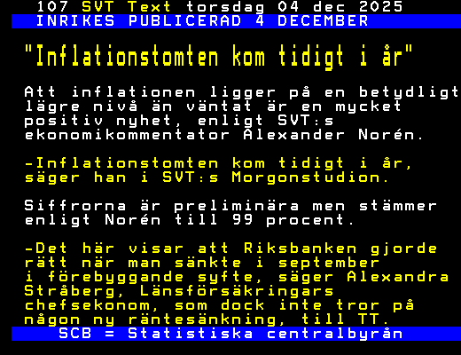 SVT Text Tors 04 Dec. 2025 INRIKES PUBLICERAD 4 DECEMBER "Inflationstomten kom tidigt i år" Att inflationen ligger på en betydligt lägre nivå än väntat är en mycket positiv nyhet, enligt SVT:s ekonomikommentator Alexander Norén. -Inflationstomten kom tidigt i år, säger han i SVT:s Morgonstudion. Siffrorna är preliminära men stämmer enligt Norén till 99 procent. -Det här visar att Riksbanken gjorde rätt när man sänkte i september i förebyggande syfte, säger Alexandra Stråberg, Länsförsäkringars chefsekonom, som dock inte tror på någon ny räntesänkning, till TT. SCB = Statistiska centralbyrån +Dela 08:59