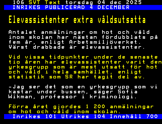 SVT Text Tors 04 Dec. 2025 INRIKES PUBLICERAD 4 DECEMBER Elevassistenter extra våldsutsatta Antalet anmälningar om hot och våld inom skolan har nästan fördubblats på fem år, enligt Arbetsmiljöverket. Värst drabbade är elevassistenter. Vid vissa tidpunkter under de senaste tio åren har elevassistenter varit den yrkesgrupp som är mest utsatt för hot och våld i hela samhället, enligt statistik som SR har tagit del av. -Jag ser det som en yrkesgrupp som vi kastar under bussen, säger Sofia Wikman, professor i kriminologi. Förra året gjordes 1 200 anmälningar om hot och våld inom skolan. Inrikes 101 Utrikes 104 Innehåll 700 +Dela 07:40