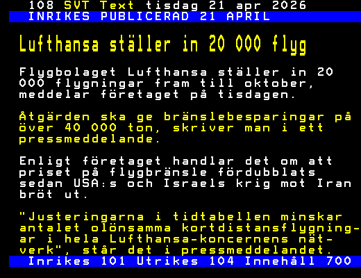 SVT Text Tis 21 Apr. 2026 INRIKES PUBLICERAD 21 APRIL Lufthansa ställer in 20 000 flyg Flygbolaget Lufthansa ställer in 20 000 flygningar fram till oktober, meddelar företaget på tisdagen. Åtgärden ska ge bränslebesparingar på över 40 000 ton, skriver man i ett pressmeddelande. Enligt företaget handlar det om att priset på flygbränsle fördubblats sedan USA:s och Israels krig mot Iran bröt ut. "Justeringarna i tidtabellen minskar antalet olönsamma kortdistansflygning- ar i hela Lufthansa-koncernens nät- verk", står det i pressmeddelandet. Inrikes 101 Utrikes 104 Innehåll 700 +Dela 1 dag