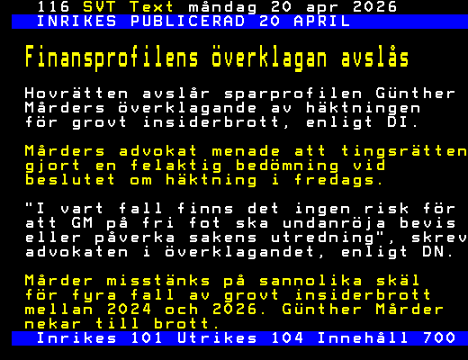 SVT Text Mån 20 Apr. 2026 INRIKES PUBLICERAD 20 APRIL Finansprofilens överklagan avslås Hovrätten avslår sparprofilen Günther Mårders överklagande av häktningen för grovt insiderbrott, enligt DI. Mårders advokat menade att tingsrätten gjort en felaktig bedömning vid beslutet om häktning i fredags. "I vart fall finns det ingen risk för att GM på fri fot ska undanröja bevis eller påverka sakens utredning", skrev advokaten i överklagandet, enligt DN. Mårder misstänks på sannolika skäl för fyra fall av grovt insiderbrott mellan 2024 och 2026. Günther Mårder nekar till brott. Inrikes 101 Utrikes 104 Innehåll 700 +Dela 2 dagar