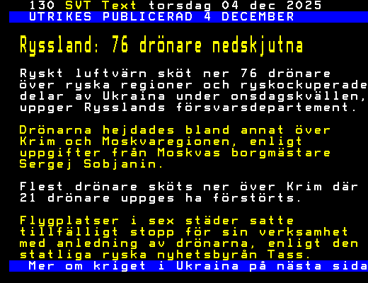SVT Text Tors 04 Dec. 2025 UTRIKES PUBLICERAD 4 DECEMBER Ryssland: 76 drönare nedskjutna Ryskt luftvärn sköt ner 76 drönare över ryska regioner och ryskockuperade delar av Ukraina under onsdagskvällen, uppger Rysslands försvarsdepartement. Drönarna hejdades bland annat över Krim och Moskvaregionen, enligt uppgifter från Moskvas borgmästare Sergej Sobjanin. Flest drönare sköts ner över Krim där 21 drönare uppges ha förstörts. Flygplatser i sex städer satte tillfälligt stopp för sin verksamhet med anledning av drönarna, enligt den statliga ryska nyhetsbyrån Tass. Mer om kriget i Ukraina på nästa sida +Dela 09:35