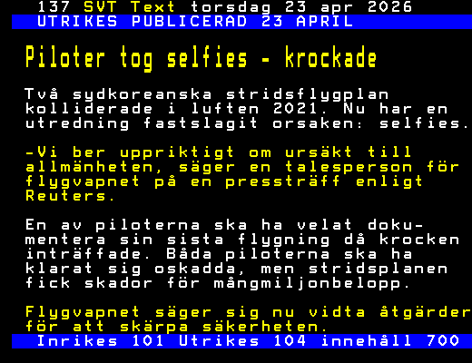 SVT Text Tors 23 Apr. 2026 UTRIKES PUBLICERAD 23 APRIL Piloter tog selfies - krockade Två sydkoreanska stridsflygplan kolliderade i luften 2021. Nu har en utredning fastslagit orsaken: selfies. -Vi ber uppriktigt om ursäkt till allmänheten, säger en talesperson för flygvapnet på en pressträff enligt Reuters. En av piloterna ska ha velat doku- mentera sin sista flygning då krocken inträffade. Båda piloterna ska ha klarat sig oskadda, men stridsplanen fick skador för mångmiljonbelopp. Flygvapnet säger sig nu vidta åtgärder för att skärpa säkerheten. Inrikes 101 Utrikes 104 innehåll 700 +Dela 12:49