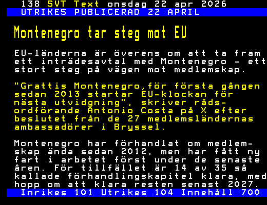 SVT Text Ons 22 Apr. 2026 UTRIKES PUBLICERAD 22 APRIL Montenegro tar steg mot EU EU-länderna är överens om att ta fram ett inträdesavtal med Montenegro - ett stort steg på vägen mot medlemskap. "Grattis Montenegro,för första gången sedan 2013 startar EU-klockan för nästa utvidgning", skriver råds- ordförande Antonio Costa på X efter beslutet från de 27 medlemsländernas ambassadörer i Bryssel. Montenegro har förhandlat om medlem- skap ända sedan 2012, men har fått ny fart i arbetet först under de senaste åren. För tillfället är 14 av 35 så kallade förhandlingskapitel klara, med hopp om att klara resten senast 2027. Inrikes 101 Utrikes 104 Innehåll 700 +Dela Igår 19:15