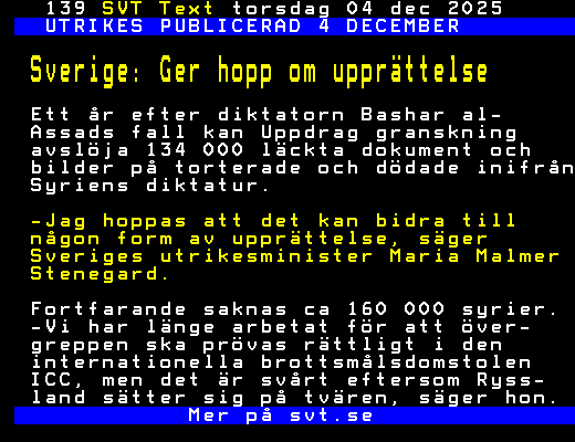 SVT Text Tors 04 Dec. 2025 UTRIKES PUBLICERAD 4 DECEMBER Sverige: Ger hopp om upprättelse Ett år efter diktatorn Bashar al- Assads fall kan Uppdrag granskning avslöja 134 000 läckta dokument och bilder på torterade och dödade inifrån Syriens diktatur. -Jag hoppas att det kan bidra till någon form av upprättelse, säger Sveriges utrikesminister Maria Malmer Stenegard. Fortfarande saknas ca 160 000 syrier. -Vi har länge arbetat för att över- greppen ska prövas rättligt i den internationella brottsmålsdomstolen ICC, men det är svårt eftersom Ryss- land sätter sig på tvären, säger hon. Mer på svt.se +Dela 15:35