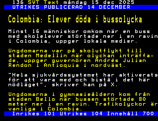 SVT Text Mån 15 Dec. 2025 UTRIKES PUBLICERAD 14 DECEMBER Colombia: Elever döda i bussolycka Minst 16 människor omkom när en buss med skolelever störtade ner i en ravin i Colombia, uppger lokala medier. Ungdomarna var på skolutflykt till staden Medellin när olyckan inträffa- de, uppger guvernören Andrés Julian Rendon i Antioquia i nordväst. "Hela sjukvårdssystemet har aktiverats för att vara med och bistå i det här nödläget", skriver han på X. Ungdomarna i gymnasieåldern kom från staden Bello när bussen störtade 80 meter ner i en ravin. Trafikolyckor är vanliga i Colombia. Inrikes 101 Utrikes 104 Innehåll 700 +Dela 06:19