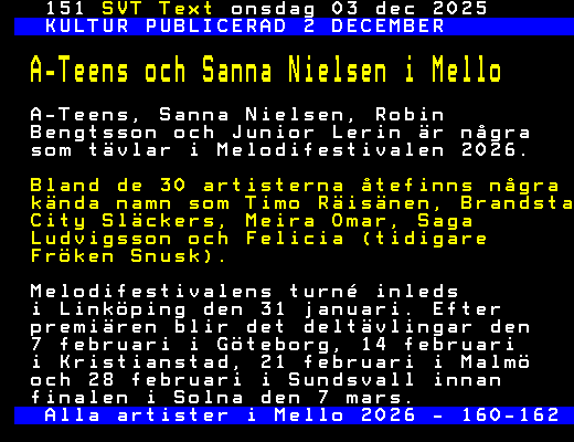 SVT Text Ons 03 Dec. 2025 KULTUR PUBLICERAD 2 DECEMBER A-Teens och Sanna Nielsen i Mello A-Teens, Sanna Nielsen, Robin Bengtsson och Junior Lerin är några som tävlar i Melodifestivalen 2026. Bland de 30 artisterna åtefinns några kända namn som Timo Räisänen, Brandsta City Släckers, Meira Omar, Saga Ludvigsson och Felicia (tidigare Fröken Snusk). Melodifestivalens turné inleds i Linköping den 31 januari. Efter premiären blir det deltävlingar den 7 februari i Göteborg, 14 februari i Kristianstad, 21 februari i Malmö och 28 februari i Sundsvall innan finalen i Solna den 7 mars. Alla artister i Mello 2026 - 160-162 +Dela Igår 05:58