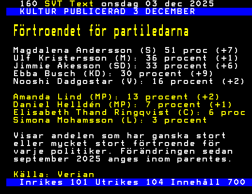 SVT Text Ons 03 Dec. 2025 KULTUR PUBLICERAD 3 DECEMBER Förtroendet för partiledarna Magdalena Andersson (S) 51 proc (+7) Ulf Kristersson (M): 36 procent (+1) Jimmie Åkesson (SD): 33 procent (+6) Ebba Busch (KD): 30 procent (+9) Nooshi Dadgostar (V): 16 procent (+2) Amanda Lind (MP): 13 procent (+2) Daniel Helldén (MP): 7 procent (+1) Elisabeth Thand Ringqvist (C): 6 proc Simona Mohamsson (L): 3 procent Visar andelen som har ganska stort eller mycket stort förtroende för varje politiker. Förändringen sedan september 2025 anges inom parentes. Källa: Verian Inrikes 101 Utrikes 104 Innehåll 700 +Dela Igår 10:49