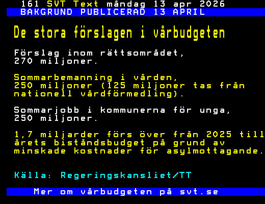 SVT Text Mån 13 Apr. 2026 BAKGRUND PUBLICERAD 13 APRIL De stora förslagen i vårbudgeten Förslag inom rättsområdet, 270 miljoner. Sommarbemanning i vården, 250 miljoner (125 miljoner tas från nationell vårdförmedling). Sommarjobb i kommunerna för unga, 250 miljoner. 1,7 miljarder förs över från 2025 till årets biståndsbudget på grund av minskade kostnader för asylmottagande. Källa: Regeringskansliet/TT Mer om vårbudgeten på svt.se +Dela 10 dagar