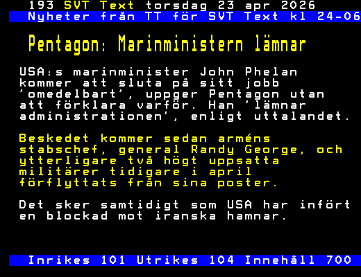 SVT Text Tors 23 Apr. 2026 Nyheter från TT för SVT Text kl 24-06 Pentagon: Marinministern lämnar USA:s marinminister John Phelan kommer att sluta på sitt jobb 'omedelbart', uppger Pentagon utan att förklara varför. Han 'lämnar administrationen', enligt uttalandet. Beskedet kommer sedan arméns stabschef, general Randy George, och ytterligare två högt uppsatta militärer tidigare i april förflyttats från sina poster. Det sker samtidigt som USA har infört en blockad mot iranska hamnar. Inrikes 101 Utrikes 104 Innehåll 700 +Dela 01:49
