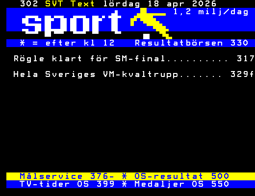 SVT Text Lör 18 Apr. 2026 1,2 milj/dag * = efter kl 12 Resultatbörsen 330 Rögle klart för SM-final.......... 317 Hela Sveriges VM-kvaltrupp....... 329f Målservice 376- * OS-resultat 500 TV-tider OS 399 * Medaljer OS 550 +Dela 4 dagar
