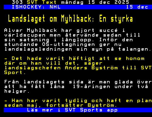 SVT Text Mån 15 Dec. 2025 ISHOCKEY: NHL 15 dec Landslaget om Myhlback: En styrka Alvar Myhlback har gjort succé i världscupen men återvände sedan till sin satsning i långlopp. Inför den stundande OS-uttagningen ger nu landslagsledningen sin syn på talangen. - Det hade varit häftigt att se honom där om han vill det, säger landslagschefen Anders Byström till SVT Sport. Från landslagets sida är man glada över att ha fått låna 19-åringen under två helger. - Han har varit tydlig och haft en plan sedan maj, fortsätter Byström. Läs mer i SVT Sports app +Dela 12:18