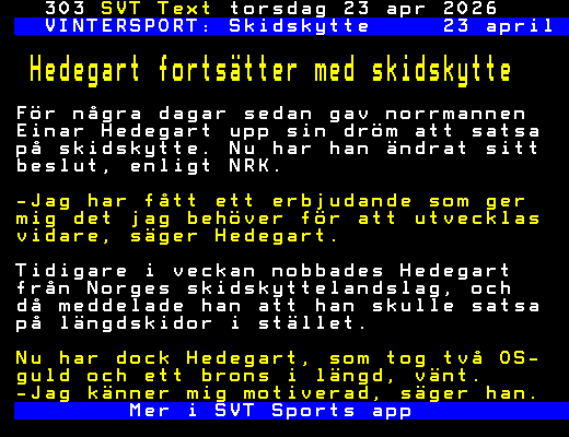 SVT Text Tors 23 Apr. 2026 VINTERSPORT: Skidskytte 23 april Hedegart fortsätter med skidskytte För några dagar sedan gav norrmannen Einar Hedegart upp sin dröm att satsa på skidskytte. Nu har han ändrat sitt beslut, enligt NRK. -Jag har fått ett erbjudande som ger mig det jag behöver för att utvecklas vidare, säger Hedegart. Tidigare i veckan nobbades Hedegart från Norges skidskyttelandslag, och då meddelade han att han skulle satsa på längdskidor i stället. Nu har dock Hedegart, som tog två OS- guld och ett brons i längd, vänt. -Jag känner mig motiverad, säger han. Mer i SVT Sports app +Dela 10:46