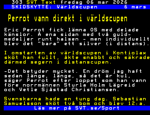 SVT Text Fre 06 Mars 2026 SKIDSKYTTE: Världscupen 6 mars Perrot vann direkt i världscupen Eric Perrot fick lämna OS med delade känslor. Å ena sidan med två guld- medaljer runt halsen - men individuellt blev det "bara" ett silver (i distans). I omstarten av världscupen i Kontiolax sköt han fullt, åkte snabbt och säkrade därmed segern i distanscupen. -Det betyder mycket. En dröm jag haft sedan länge, länge, så det är kul, säger Perrot efter loppet som han vann före norrmännen Sturla Holm Lägreid och Vetle Sjåstad Christiansen. Svenskarna hade en tung dag. Sebastian Samuelsson sköt två bom och blev 12:a. Läs mer på SVT.se/Sport +Dela Igår 19:06