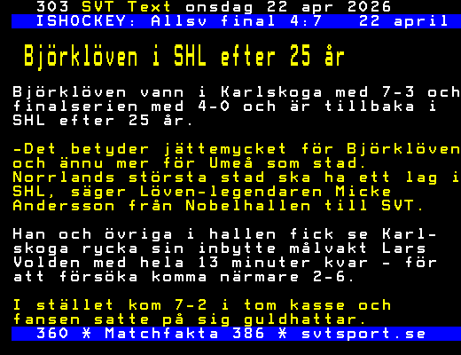 SVT Text Ons 22 Apr. 2026 ISHOCKEY: Allsv final 4:7 22 april Björklöven i SHL efter 25 år Björklöven vann i Karlskoga med 7-3 och finalserien med 4-0 och är tillbaka i SHL efter 25 år. -Det betyder jättemycket för Björklöven och ännu mer för Umeå som stad. Norrlands största stad ska ha ett lag i SHL, säger Löven-legendaren Micke Andersson från Nobelhallen till SVT. Han och övriga i hallen fick se Karl- skoga rycka sin inbytte målvakt Lars Volden med hela 13 minuter kvar - för att försöka komma närmare 2-6. I stället kom 7-2 i tom kasse och fansen satte på sig guldhattar. 360 * Matchfakta 386 * svtsport.se +Dela Igår 21:28
