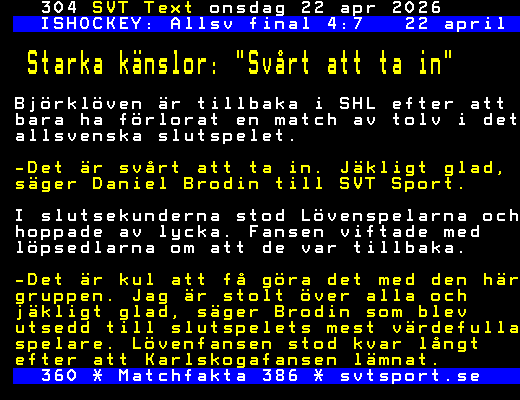 SVT Text Ons 22 Apr. 2026 ISHOCKEY: Allsv final 4:7 22 april Starka känslor: "Svårt att ta in" Björklöven är tillbaka i SHL efter att bara ha förlorat en match av tolv i det allsvenska slutspelet. -Det är svårt att ta in. Jäkligt glad, säger Daniel Brodin till SVT Sport. I slutsekunderna stod Lövenspelarna och hoppade av lycka. Fansen viftade med löpsedlarna om att de var tillbaka. -Det är kul att få göra det med den här gruppen. Jag är stolt över alla och jäkligt glad, säger Brodin som blev utsedd till slutspelets mest värdefulla spelare. Lövenfansen stod kvar långt efter att Karlskogafansen lämnat. 360 * Matchfakta 386 * svtsport.se +Dela Igår 22:44