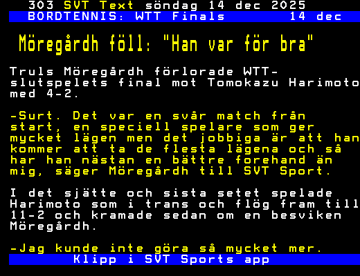 SVT Text Sön 14 Dec. 2025 BORDTENNIS: WTT Finals 14 dec Möregårdh föll: "Han var för bra" Truls Möregårdh förlorade WTT- slutspelets final mot Tomokazu Harimoto med 4-2. -Surt. Det var en svår match från start, en speciell spelare som ger mycket lägen men det jobbiga är att han kommer att ta de flesta lägena och så har han nästan en bättre forehand än mig, säger Möregårdh till SVT Sport. I det sjätte och sista setet spelade Harimoto som i trans och flög fram till 11-2 och kramade sedan om en besviken Möregårdh. -Jag kunde inte göra så mycket mer. Klipp i SVT Sports app +Dela Igår 15:10