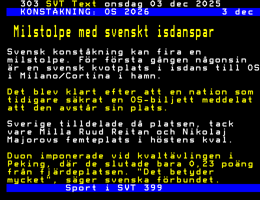 SVT Text Ons 03 Dec. 2025 KONSTÅKNING: OS 2026 3 dec Milstolpe med svenskt isdanspar Svensk konståkning kan fira en milstolpe. För första gången någonsin är en svensk kvotplats i isdans till OS i Milano/Cortina i hamn. Det blev klart efter att en nation som tidigare säkrat en OS-biljett meddelat att den avstår sin plats. Sverige tilldelade då platsen, tack vare Milla Ruud Reitan och Nikolaj Majorovs femteplats i höstens kval. Duon imponerade vid kvaltävlingen i Peking, där de slutade bara 0,23 poäng från fjärdeplatsen. "Det betyder mycket", säger svenska förbundet. Sport i SVT 399 +Dela Igår 12:29