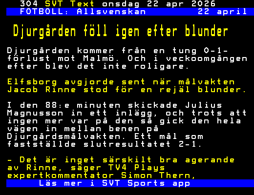 SVT Text Ons 22 Apr. 2026 FOTBOLL: Allsvenskan 22 april Djurgården föll igen efter blunder Djurgården kommer från en tung 0-1- förlust mot Malmö. Och i veckoomgången efter blev det inte roligare. Elfsborg avgjorde sent när målvakten Jacob Rinne stod för en rejäl blunder. I den 88:e minuten skickade Julius Magnusson in ett inlägg, och trots att ingen mer var på den så gick den hela vägen in mellan benen på Djurgårdsmålvakten. Ett mål som fastställde slutresultatet 2-1. - Det är inget särskilt bra agerande av Rinne, säger TV4 Plays expertkommentator Simon Thern, Läs mer i SVT Sports app +Dela Igår 21:16
