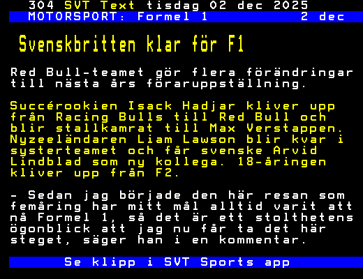 SVT Text Tis 02 Dec. 2025 MOTORSPORT: Formel 1 2 dec Svenskbritten klar för F1 Red Bull-teamet gör flera förändringar till nästa års föraruppställning. Succérookien Isack Hadjar kliver upp från Racing Bulls till Red Bull och blir stallkamrat till Max Verstappen. Nyzeeländaren Liam Lawson blir kvar i systerteamet och får svenske Arvid Lindblad som ny kollega. 18-åringen kliver upp från F2. - Sedan jag började den här resan som femåring har mitt mål alltid varit att nå Formel 1, så det är ett stolthetens ögonblick att jag nu får ta det här steget, säger han i en kommentar. Se klipp i SVT Sports app +Dela 1 dag