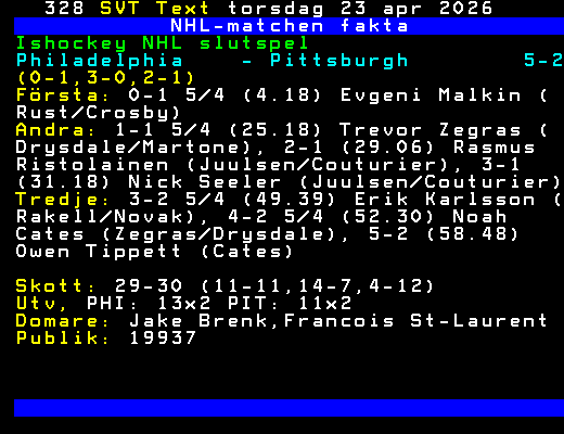 NHL-matchen fakta Ishockey NHL slutspel Philadelphia - Pittsburgh 5-2 (0-1,3-0,2-1) Första: 0-1 5/4 (4.18) Evgeni Malkin ( Rust/Crosby) Andra: 1-1 5/4 (25.18) Trevor Zegras ( Drysdale/Martone), 2-1 (29.06) Rasmus Ristolainen (Juulsen/Couturier), 3-1 (31.18) Nick Seeler (Juulsen/Couturier) Tredje: 3-2 5/4 (49.39) Erik Karlsson ( Rakell/Novak), 4-2 5/4 (52.30) Noah Cates (Zegras/Drysdale), 5-2 (58.48) Owen Tippett (Cates) Skott: 29-30 (11-11,14-7,4-12) Utv, PHI: 13x2 PIT: 11x2 Domare: Jake Brenk,Francois St-Laurent Publik: 19937 +Dela 05:20