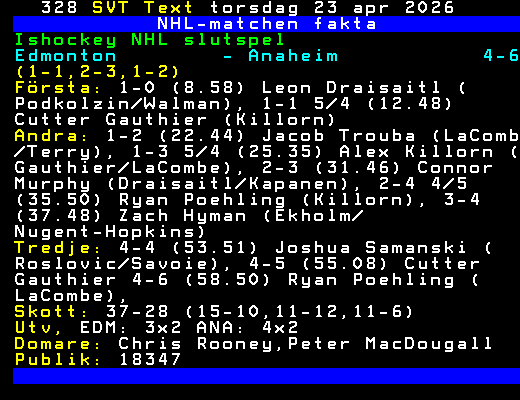 SVT Text Tors 23 Apr. 2026 NHL-matchen fakta Ishockey NHL slutspel Edmonton - Anaheim 4-6 (1-1,2-3,1-2) Första: 1-0 (8.58) Leon Draisaitl ( Podkolzin/Walman), 1-1 5/4 (12.48) Cutter Gauthier (Killorn) Andra: 1-2 (22.44) Jacob Trouba (LaComb /Terry), 1-3 5/4 (25.35) Alex Killorn ( Gauthier/LaCombe), 2-3 (31.46) Connor Murphy (Draisaitl/Kapanen), 2-4 4/5 (35.50) Ryan Poehling (Killorn), 3-4 (37.48) Zach Hyman (Ekholm/ Nugent-Hopkins) Tredje: 4-4 (53.51) Joshua Samanski ( Roslovic/Savoie), 4-5 (55.08) Cutter Gauthier 4-6 (58.50) Ryan Poehling ( LaCombe), Skott: 37-28 (15-10,11-12,11-6) Utv, EDM: 3x2 ANA: 4x2 Domare: Chris Rooney,Peter MacDougall Publik: 18347 +Dela 07:35