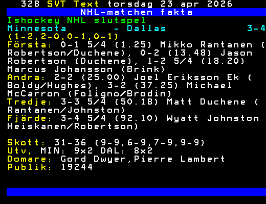 NHL-matchen fakta Ishockey NHL slutspel Minnesota - Dallas 3-4 (1-2,2-0,0-1,0-1) Första: 0-1 5/4 (1.25) Mikko Rantanen ( Robertson/Duchene), 0-2 (13.48) Jason Robertson (Duchene), 1-2 5/4 (18.20) Marcus Johansson (Brink) Andra: 2-2 (25.00) Joel Eriksson Ek ( Boldy/Hughes), 3-2 (37.25) Michael McCarron (Foligno/Brodin) Tredje: 3-3 5/4 (50.18) Matt Duchene ( Rantanen/Johnston) Fjärde: 3-4 5/4 (92.10) Wyatt Johnston Heiskanen/Robertson) Skott: 31-36 (9-9,6-9,7-9,9-9) Utv, MIN: 9x2 DAL: 8x2 Domare: Gord Dwyer,Pierre Lambert Publik: 19244 +Dela 08:04