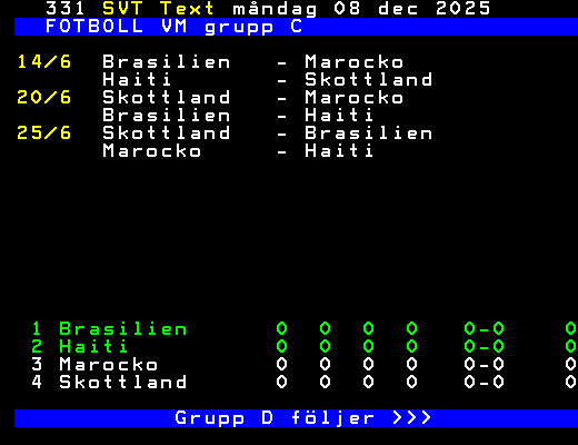 FOTBOLL VM grupp C 14/6 Brasilien - Marocko Haiti - Skottland 20/6 Skottland - Marocko Brasilien - Haiti 25/6 Skottland - Brasilien Marocko - Haiti 1 Brasilien 0 0 0 0 0-0 0 2 Haiti 0 0 0 0 0-0 0 3 Marocko 0 0 0 0 0-0 0 4 Skottland 0 0 0 0 0-0 0 Grupp D följer >>> +Dela 135 dagar