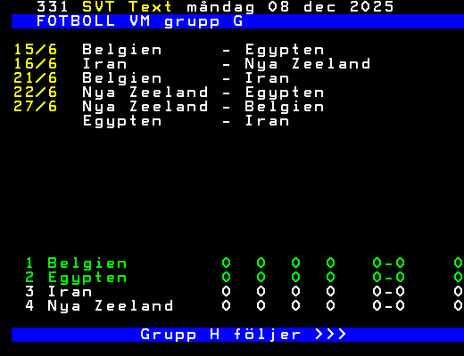 FOTBOLL VM grupp G 15/6 Belgien - Egypten 16/6 Iran - Nya Zeeland 21/6 Belgien - Iran 22/6 Nya Zeeland - Egypten 27/6 Nya Zeeland - Belgien Egypten - Iran 1 Belgien 0 0 0 0 0-0 0 2 Egypten 0 0 0 0 0-0 0 3 Iran 0 0 0 0 0-0 0 4 Nya Zeeland 0 0 0 0 0-0 0 Grupp H följer >>> +Dela 135 dagar