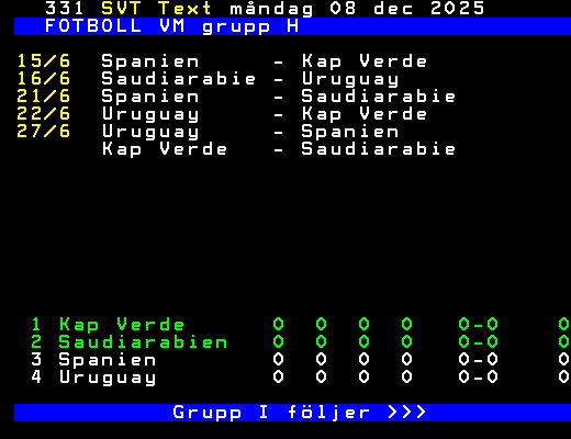 FOTBOLL VM grupp H 15/6 Spanien - Kap Verde 16/6 Saudiarabie - Uruguay 21/6 Spanien - Saudiarabie 22/6 Uruguay - Kap Verde 27/6 Uruguay - Spanien Kap Verde - Saudiarabie 1 Kap Verde 0 0 0 0 0-0 0 2 Saudiarabien 0 0 0 0 0-0 0 3 Spanien 0 0 0 0 0-0 0 4 Uruguay 0 0 0 0 0-0 0 Grupp I följer >>> +Dela 135 dagar