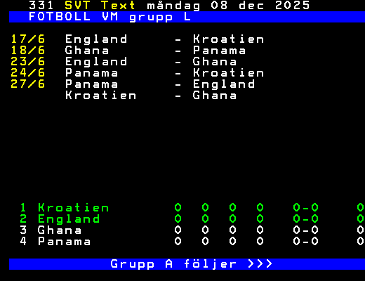 FOTBOLL VM grupp L 17/6 England - Kroatien 18/6 Ghana - Panama 23/6 England - Ghana 24/6 Panama - Kroatien 27/6 Panama - England Kroatien - Ghana 1 Kroatien 0 0 0 0 0-0 0 2 England 0 0 0 0 0-0 0 3 Ghana 0 0 0 0 0-0 0 4 Panama 0 0 0 0 0-0 0 Grupp A följer >>> +Dela 135 dagar
