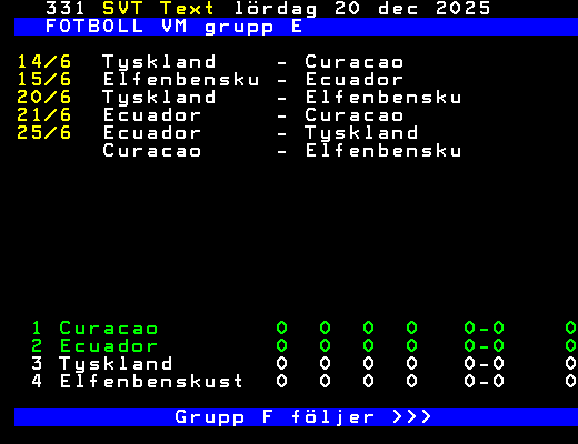 FOTBOLL VM grupp E 14/6 Tyskland - Curacao 15/6 Elfenbensku - Ecuador 20/6 Tyskland - Elfenbensku 21/6 Ecuador - Curacao 25/6 Ecuador - Tyskland Curacao - Elfenbensku 1 Curacao 0 0 0 0 0-0 0 2 Ecuador 0 0 0 0 0-0 0 3 Tyskland 0 0 0 0 0-0 0 4 Elfenbenskust 0 0 0 0 0-0 0 Grupp F följer >>> +Dela 123 dagar
