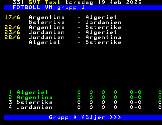 FOTBOLL VM grupp J 17/6 Argentina - Algeriet Österrike - Jordanien 22/6 Argentina - Österrike 23/6 Jordanien - Algeriet 28/6 Jordanien - Argentina Algeriet - Österrike 1 Algeriet 0 0 0 0 0-0 0 2 Argentina 0 0 0 0 0-0 0 3 Österrike 0 0 0 0 0-0 0 4 Jordanien 0 0 0 0 0-0 0 Grupp K följer >>> +Dela 62 dagar