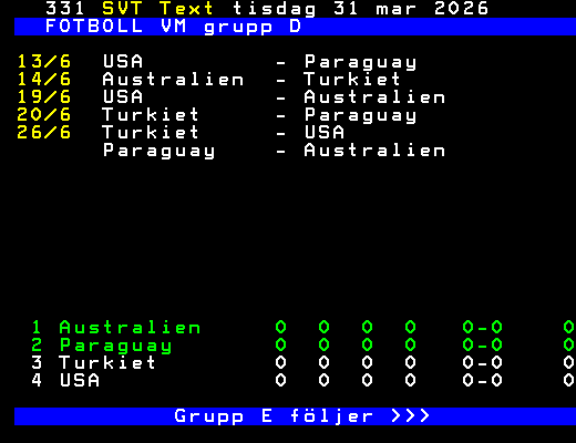 FOTBOLL VM grupp D 13/6 USA - Paraguay 14/6 Australien - Turkiet 19/6 USA - Australien 20/6 Turkiet - Paraguay 26/6 Turkiet - USA Paraguay - Australien 1 Australien 0 0 0 0 0-0 0 2 Paraguay 0 0 0 0 0-0 0 3 Turkiet 0 0 0 0 0-0 0 4 USA 0 0 0 0 0-0 0 Grupp E följer >>> +Dela 22 dagar