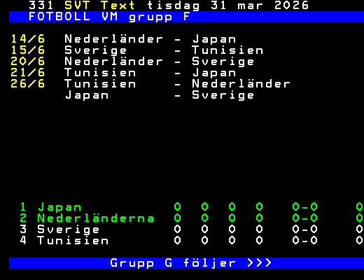 FOTBOLL VM grupp F 14/6 Nederländer - Japan 15/6 Sverige - Tunisien 20/6 Nederländer - Sverige 21/6 Tunisien - Japan 26/6 Tunisien - Nederländer Japan - Sverige 1 Japan 0 0 0 0 0-0 0 2 Nederländerna 0 0 0 0 0-0 0 3 Sverige 0 0 0 0 0-0 0 4 Tunisien 0 0 0 0 0-0 0 Grupp G följer >>> +Dela 22 dagar