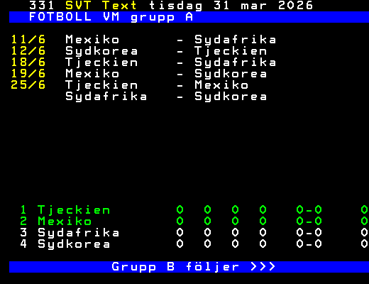 SVT Text Tis 31 Mars 2026 FOTBOLL VM grupp A 11/6 Mexiko - Sydafrika 12/6 Sydkorea - Tjeckien 18/6 Tjeckien - Sydafrika 19/6 Mexiko - Sydkorea 25/6 Tjeckien - Mexiko Sydafrika - Sydkorea 1 Tjeckien 0 0 0 0 0-0 0 2 Mexiko 0 0 0 0 0-0 0 3 Sydafrika 0 0 0 0 0-0 0 4 Sydkorea 0 0 0 0 0-0 0 Grupp B följer >>> +Dela 22 dagar