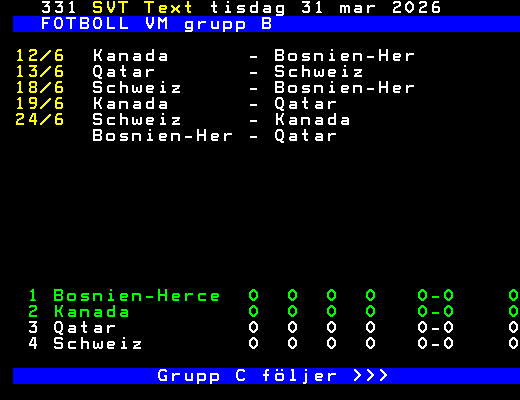 FOTBOLL VM grupp B 12/6 Kanada - Bosnien-Her 13/6 Qatar - Schweiz 18/6 Schweiz - Bosnien-Her 19/6 Kanada - Qatar 24/6 Schweiz - Kanada Bosnien-Her - Qatar 1 Bosnien-Herce 0 0 0 0 0-0 0 2 Kanada 0 0 0 0 0-0 0 3 Qatar 0 0 0 0 0-0 0 4 Schweiz 0 0 0 0 0-0 0 Grupp C följer >>> +Dela 22 dagar