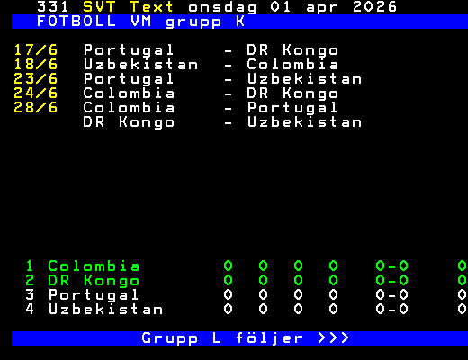 FOTBOLL VM grupp K 17/6 Portugal - DR Kongo 18/6 Uzbekistan - Colombia 23/6 Portugal - Uzbekistan 24/6 Colombia - DR Kongo 28/6 Colombia - Portugal DR Kongo - Uzbekistan 1 Colombia 0 0 0 0 0-0 0 2 DR Kongo 0 0 0 0 0-0 0 3 Portugal 0 0 0 0 0-0 0 4 Uzbekistan 0 0 0 0 0-0 0 Grupp L följer >>> +Dela 22 dagar