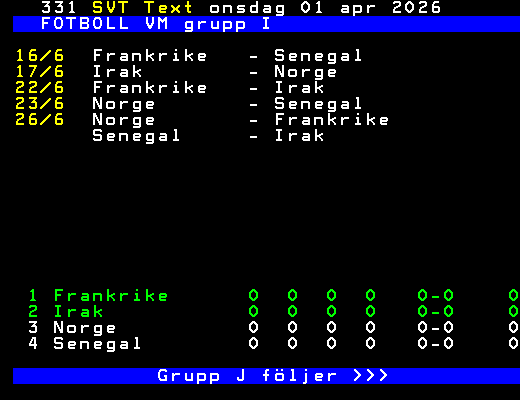 FOTBOLL VM grupp I 16/6 Frankrike - Senegal 17/6 Irak - Norge 22/6 Frankrike - Irak 23/6 Norge - Senegal 26/6 Norge - Frankrike Senegal - Irak 1 Frankrike 0 0 0 0 0-0 0 2 Irak 0 0 0 0 0-0 0 3 Norge 0 0 0 0 0-0 0 4 Senegal 0 0 0 0 0-0 0 Grupp J följer >>> +Dela 22 dagar