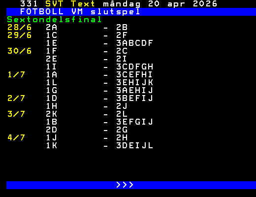 FOTBOLL VM slutspel Sextondelsfinal 28/6 2A - 2B 29/6 1C - 2F 1E - 3ABCDF 30/6 1F - 2C 2E - 2I 1I - 3CDFGH 1/7 1A - 3CEFHI 1L - 3EHIJK 1G - 3AEHIJ 2/7 1D - 3BEFIJ 1H - 2J 3/7 2K - 2L 1B - 3EFGIJ 2D - 2G 4/7 1J - 2H 1K - 3DEIJL >>> +Dela 2 dagar