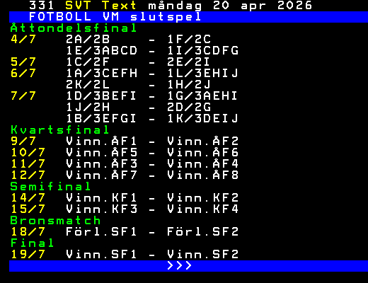 FOTBOLL VM slutspel Åttondelsfinal 4/7 2A/2B - 1F/2C 1E/3ABCD - 1I/3CDFG 5/7 1C/2F - 2E/2I 6/7 1A/3CEFH - 1L/3EHIJ 2K/2L - 1H/2J 7/7 1D/3BEFI - 1G/3AEHI 1J/2H - 2D/2G 1B/3EFGI - 1K/3DEIJ Kvartsfinal 9/7 Vinn.ÅF1 - Vinn.ÅF2 10/7 Vinn.ÅF5 - Vinn.ÅF6 11/7 Vinn.ÅF3 - Vinn.ÅF4 12/7 Vinn.ÅF7 - Vinn.ÅF8 Semifinal 14/7 Vinn.KF1 - Vinn.KF2 15/7 Vinn.KF3 - Vinn.KF4 Bronsmatch 18/7 Förl.SF1 - Förl.SF2 Final 19/7 Vinn.SF1 - Vinn.SF2 >>> +Dela 2 dagar