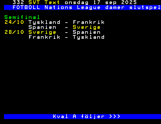 SVT Text Ons 17 Sep. 2025 FOTBOLL Nations League damer slutspel Semifinal 24/10 Tyskland - Frankrik Spanien - Sverige 28/10 Sverige - Spanien Frankrik - Tyskland Kval A följer >>> +Dela 32 dagar