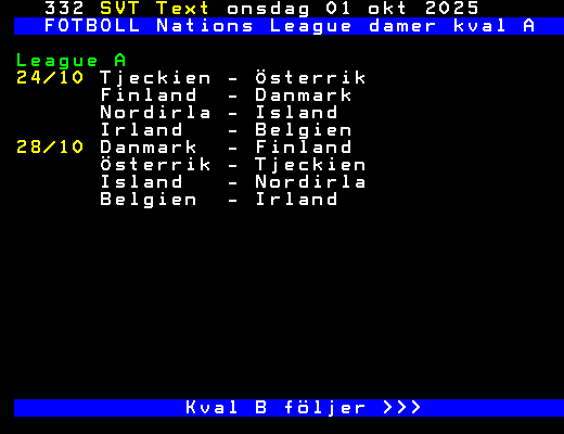 FOTBOLL Nations League damer kval A League A 24/10 Tjeckien - Österrik Finland - Danmark Nordirla - Island Irland - Belgien 28/10 Danmark - Finland Österrik - Tjeckien Island - Nordirla Belgien - Irland Kval B följer >>> +Dela 18 dagar