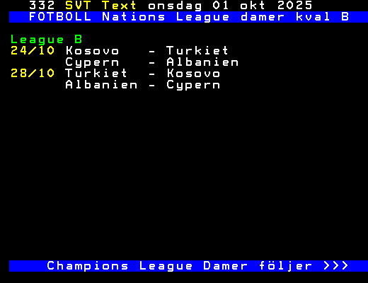 FOTBOLL Nations League damer kval B League B 24/10 Kosovo - Turkiet Cypern - Albanien 28/10 Turkiet - Kosovo Albanien - Cypern Champions League Damer följer >>> +Dela 18 dagar